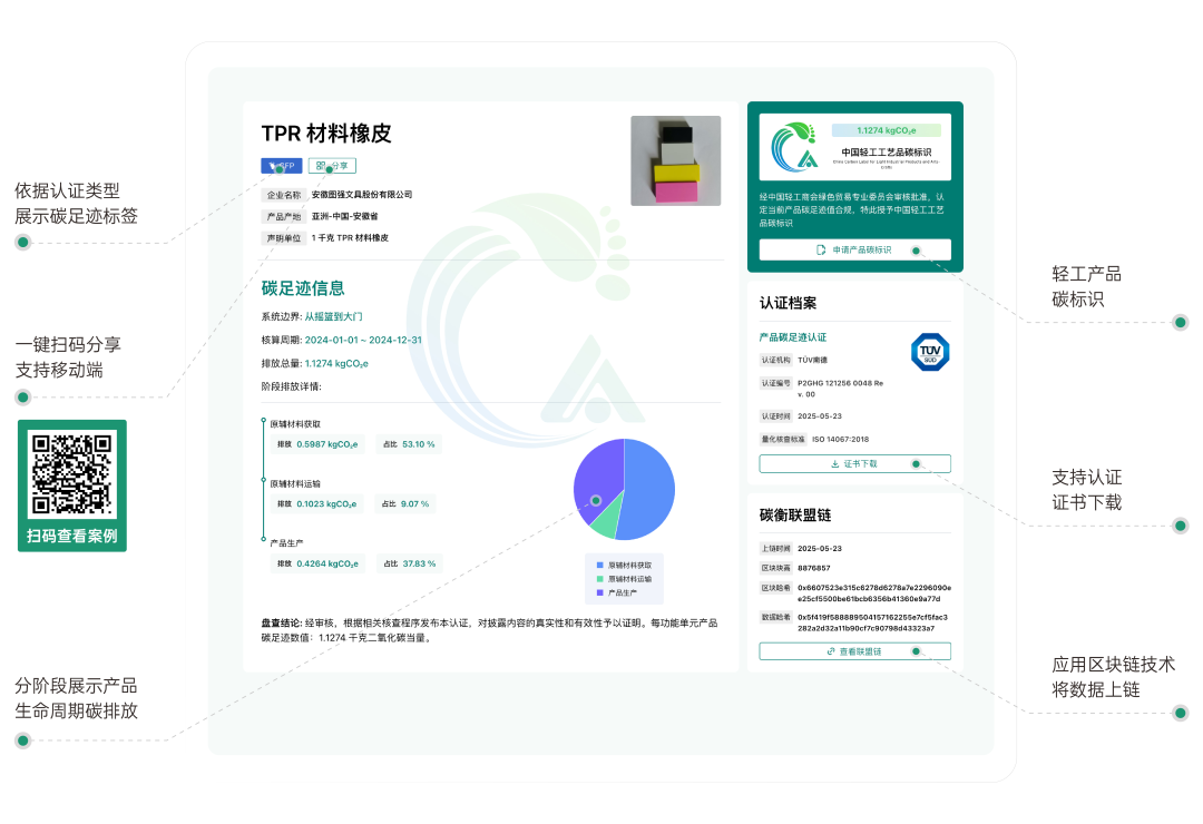 为了让这张“身份证”透明可查, 图强文具还将TPR材料橡皮的碳足迹信息上传至“中国轻工工艺品双碳信息披露平台”。通过该平台,图强文具借助数字化手段实现了碳足迹信息的可见、可溯、可认,让客户与消费者可以自主浏览查看。
