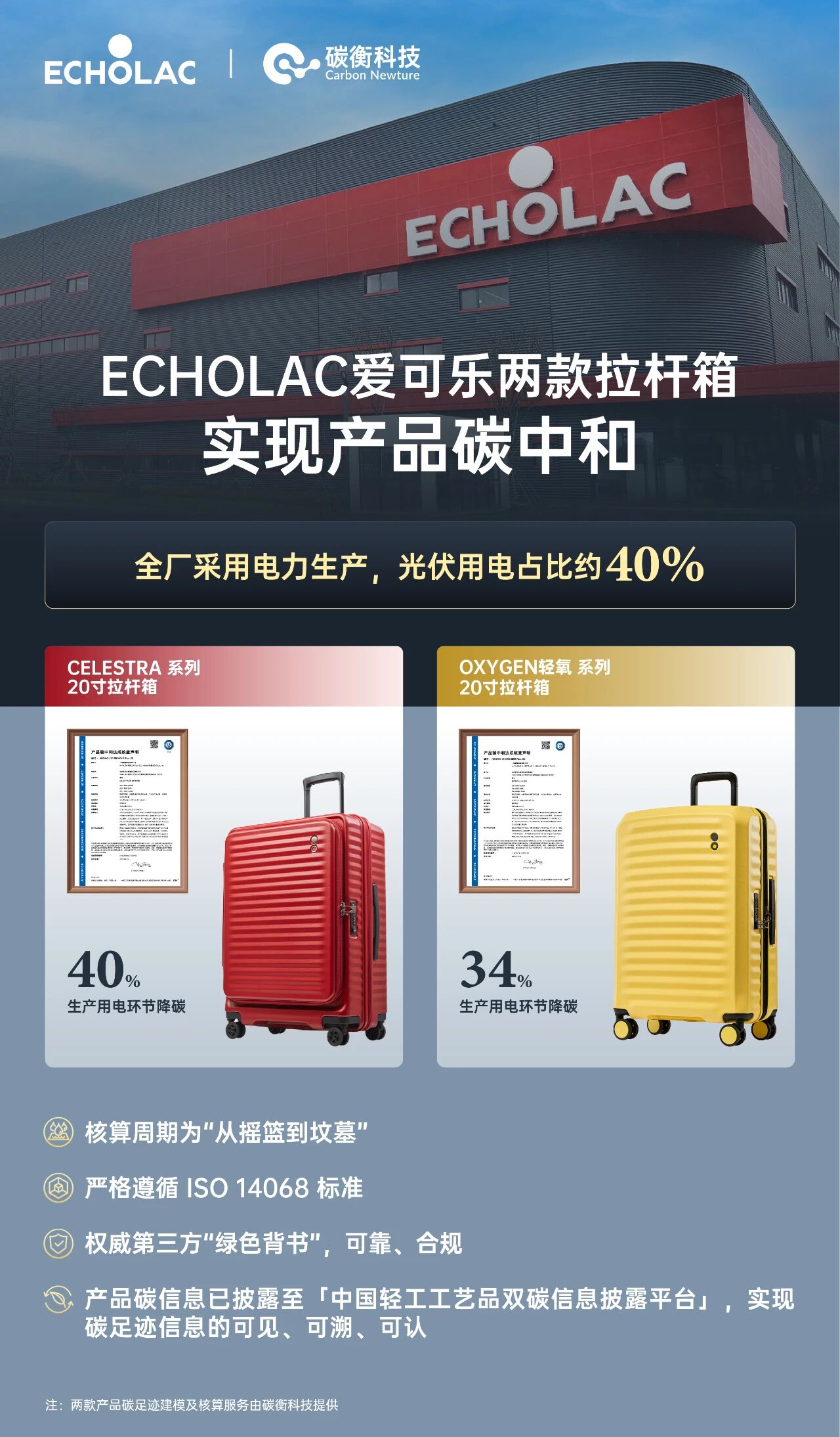 值得关注的是,这是爱可乐继CELESTRA系列20寸拉杆箱后,实现的又一次产品碳中和。通过一系列的绿色举措,爱可乐正向市场传递一个明确信号:低碳,已成为行李箱的核心属性之一。