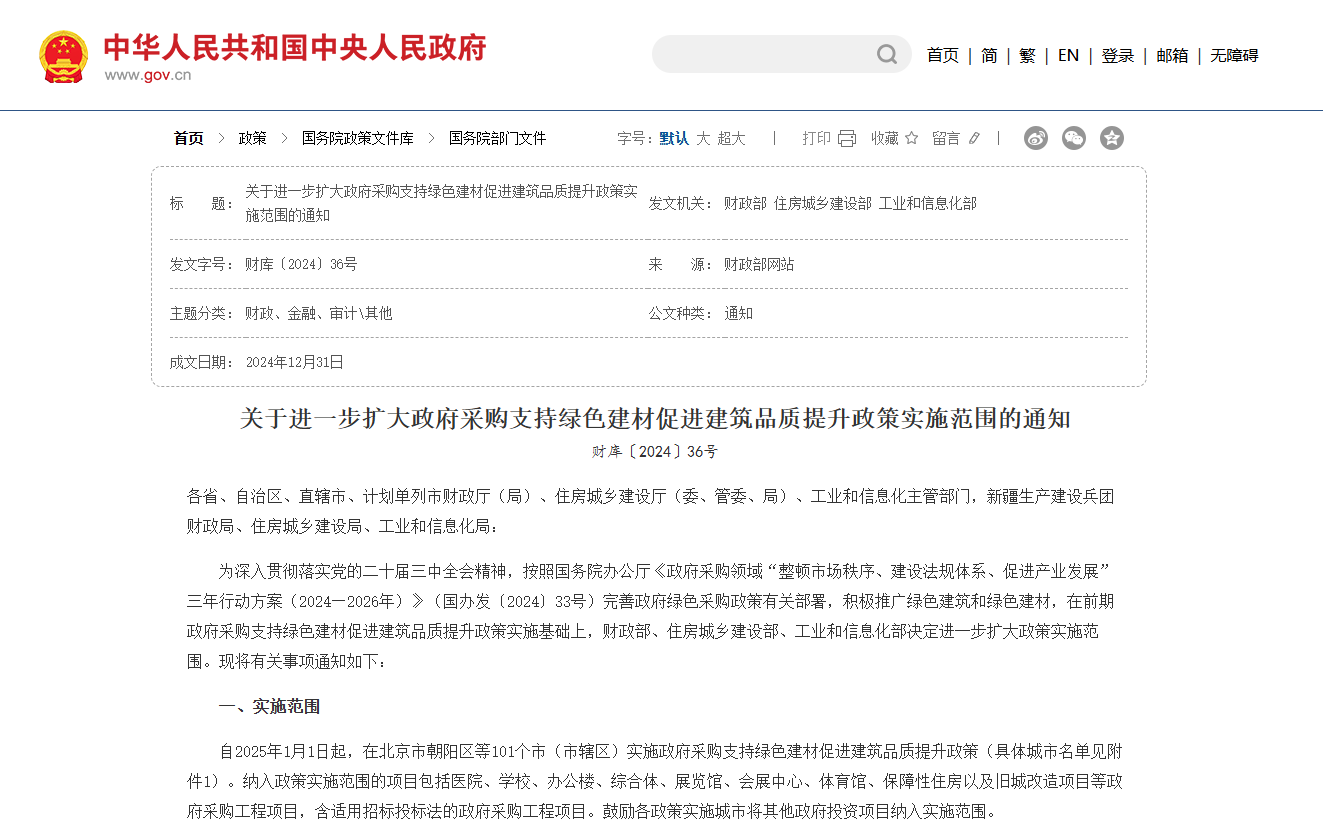 《关于进一步扩大政府采购支持绿色建材促进建筑品质提升政策实施范围的通知》,图源:中国政府网