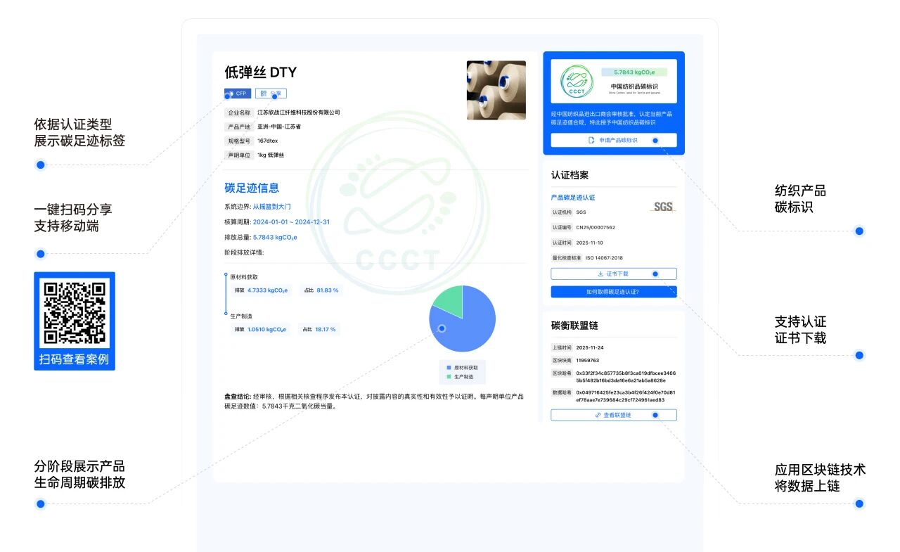 于是,在碳衡科技的帮助下,欣战江基于国际碳足迹核算标准ISO 14067:2018,为其核心产品“低弹丝 DTY”完成产品碳足迹核算,并取得国际权威第三方认证机构SGS出具的核查证书。为了让碳数据透明可见,欣战江还将该产品的碳信息披露至「国际纺织服装双碳信息披露平台」,以实际行动填补了上游原材料碳数据的空白。凭借这一举措,欣战江发挥标杆效应,有力推倒了阻碍产业链协作的“数据围墙”,带动更多纺织企业推进碳数据透明与共享,为行业低碳转型铺设一条数据畅通的“高速路”。