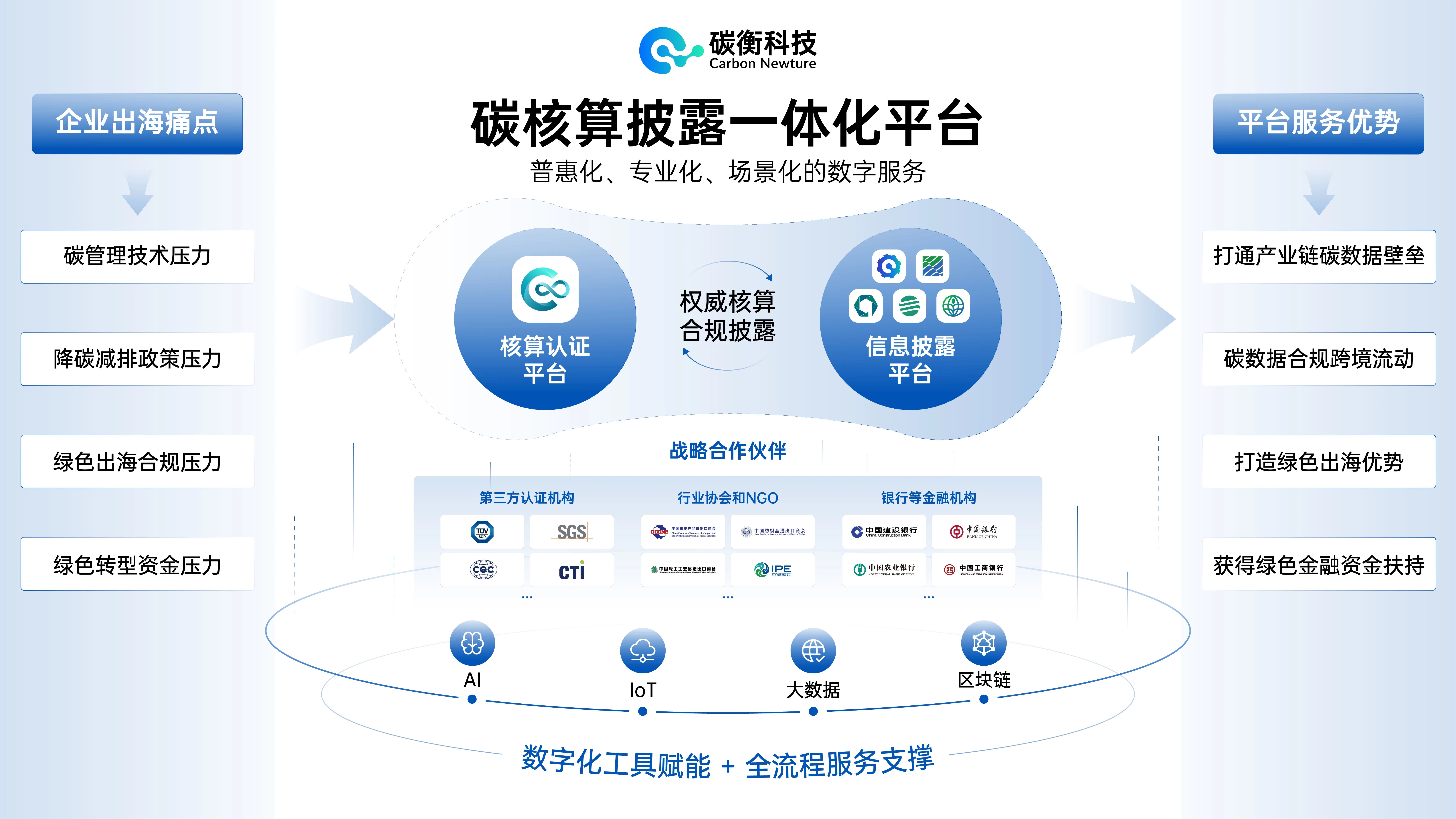 碳衡科技的“碳核算披露一体化平台”重点围绕“数字化工具赋能+全流程服务支撑”构建平台能力,深度集成AI、大数据、区块链、IoT等前沿数字化技术,聚焦中小企业绿色出海痛点,打通碳数据核算、审核认证、披露、出海各环节堵点,为企业提供普惠化、专业化、场景化的数字服务,从而打通产业链碳数据壁垒、促进碳数据合规跨境流动、打造企业绿色出海优势,并帮助企业获得绿色金融资金扶持。