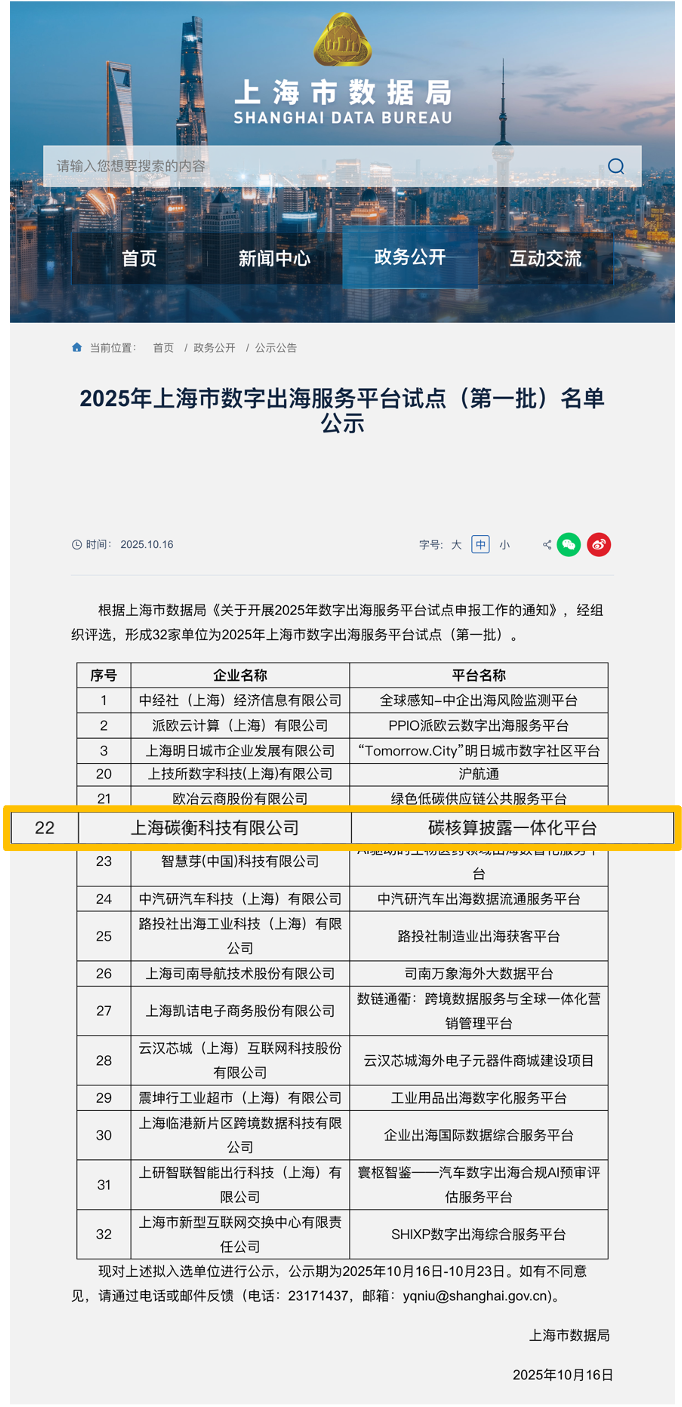 为贯彻落实市委市政府关于加强数字企业出海服务的决策部署,深化国际数据合作,加强数字出海服务供给,推动一批数字出海服务平台建设落地,上海市数据局组织开展了2025年数字出海服务平台试点申报工作。经评选,碳衡科技的“碳核算披露一体化平台”成功入选「2025年上海市数字出海服务平台试点(第一批)」。