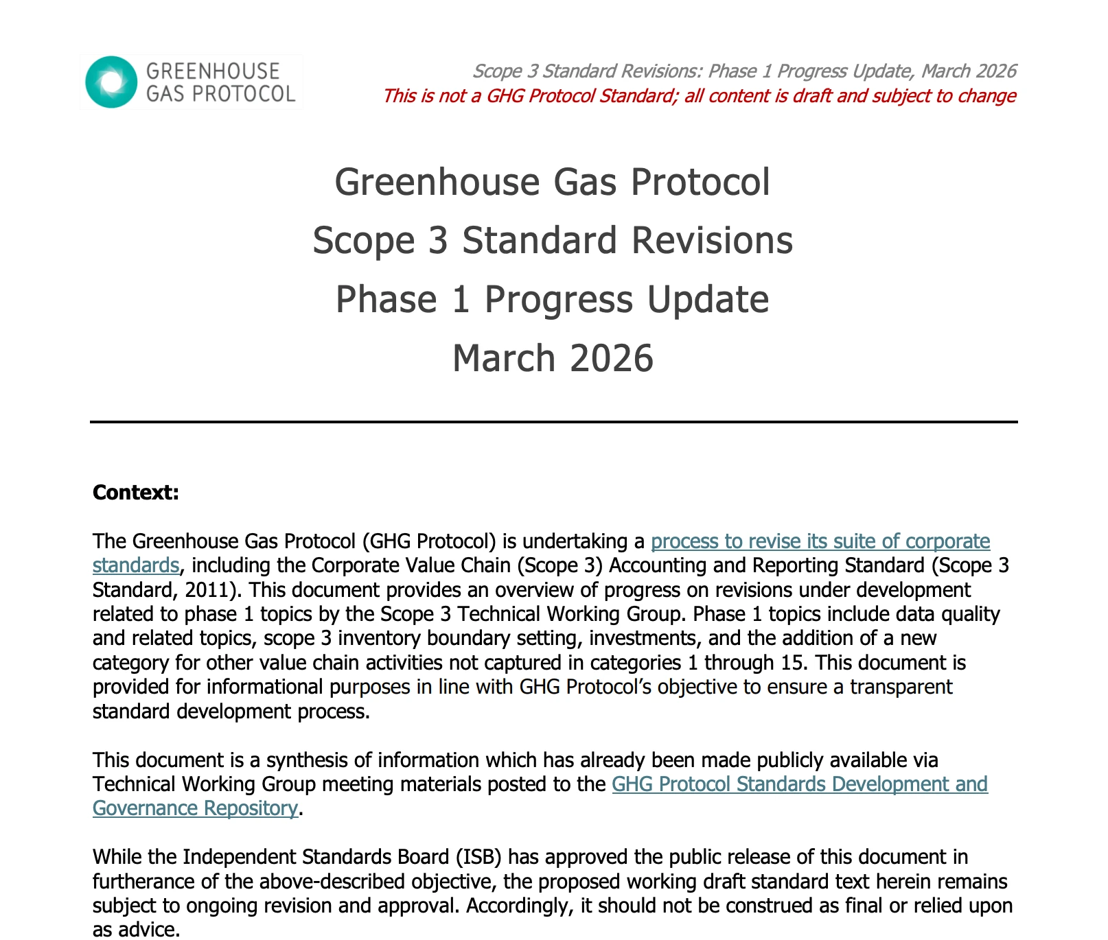 3月31日,GHG Protocol 发布范围3标准修订第一阶段进展更新(Scope 3 Standard Revisions Phase 1 Progress Update),概述了企业在衡量与报告价值链温室气体排放过程中,相关标准拟进行的调整方向。本次更新仍处于草案阶段,尚未正式生效。从当前披露内容看,对企业影响较大的方向主要包括:一是边界要求趋严的讨论,提出企业未来可能需覆盖约95%的范围3排放,并对“重大类别”(如占比≥5%)设置纳入要求;二是类别体系可能调整,在现有15类基础上,提出新增“类别16”,以覆盖当前框架未充分反映的排放活动;三是数据与方法要求强化,强调提升一手数据占比,细化支出法与活动法的适用边界,并要求披露数据质量及持续改进路径;四是供应链管理责任提升,强化数据可追溯性及供应商数据获取能力。目前,具体规则仍存在不确定性,需以最终发布标准为准。
