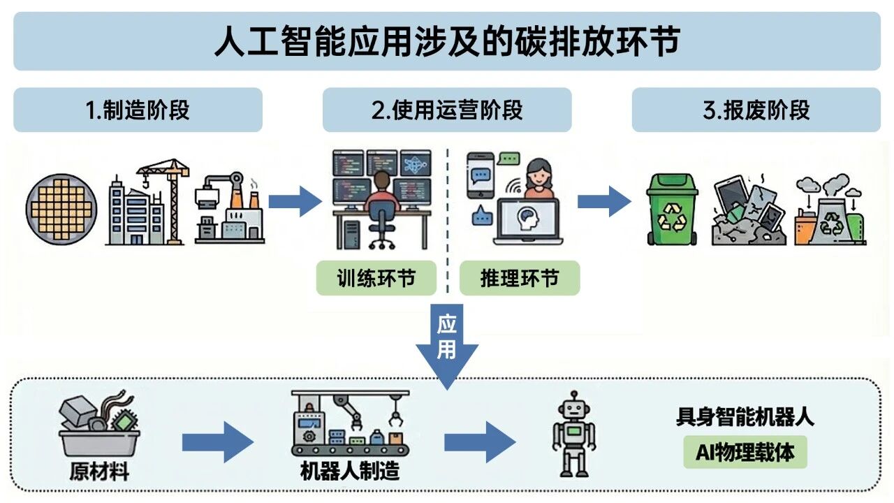 从生命周期视角审视,人工智能的碳足迹主要涵盖三个阶段:①制造阶段,涉及高精密芯片、数据中心等硬件设施的生产/建设;②使用运营阶段,包含模型高强度训练及日常推理服务产生的电力消耗;③报废阶段,涉及芯片及硬件设施的废弃与回收。此外,作为AI物理载体的具身智能机器人,其本体制造过程具有技术门槛高、依赖特定工业原材料等特点,有着较大规模的“隐含碳”。