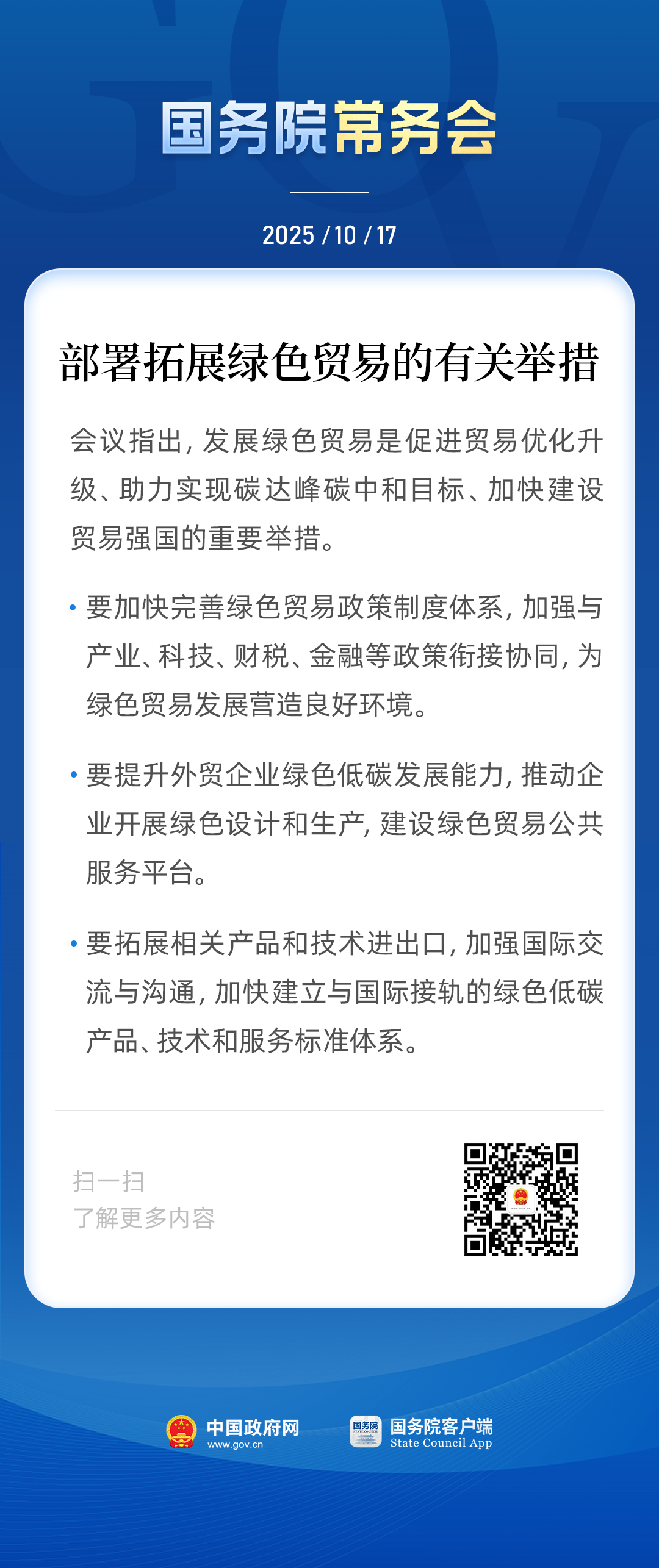 10月17日,国务院总理李强主持召开国务院常务会议,听取关于有效降低全社会物流成本行动落实情况汇报,部署拓展绿色贸易的有关举措。会议指出,发展绿色贸易是促进贸易优化升级、助力实现碳达峰碳中和目标、加快建设贸易强国的重要举措。要加快完善绿色贸易政策制度体系,加强与产业、科技、财税、金融等政策衔接协同,为绿色贸易发展营造良好环境。要提升外贸企业绿色低碳发展能力,推动企业开展绿色设计和生产,建设绿色贸易公共服务平台。要拓展相关产品和技术进出口,加强国际交流与沟通,加快建立与国际接轨的绿色低碳产品、技术和服务标准体系。