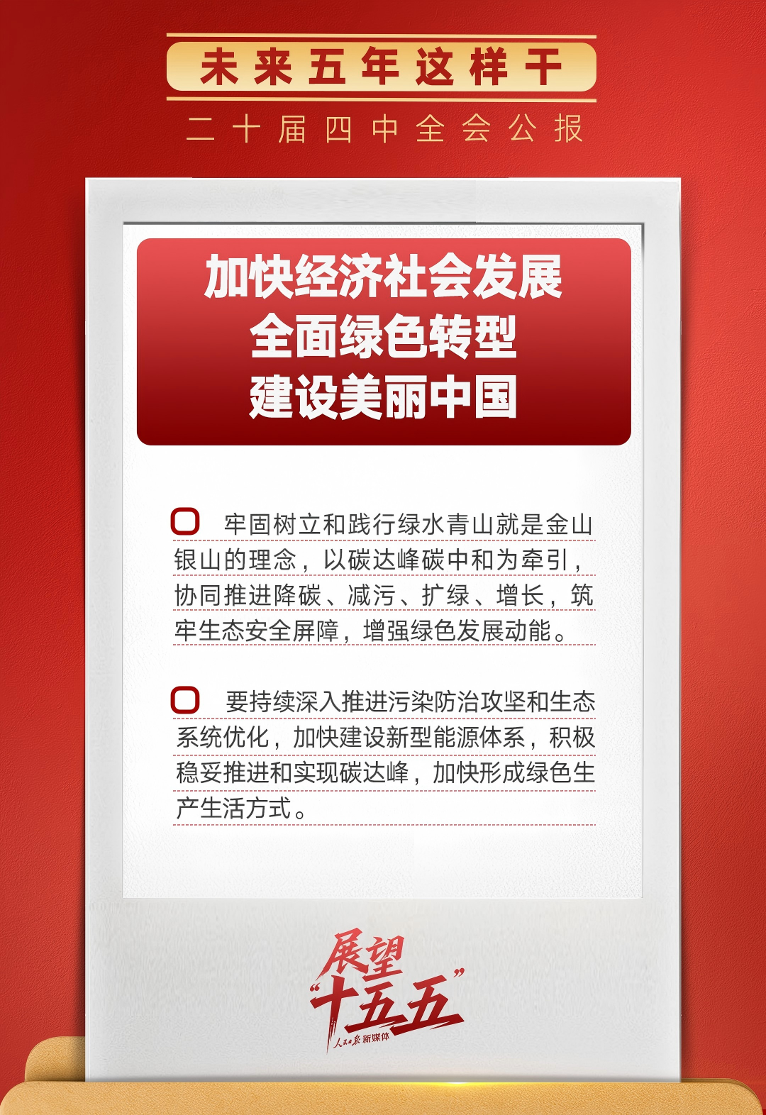 10月20日,中国共产党第二十届中央委员会第四次全体会议在北京举行。全会提出,加快经济社会发展全面绿色转型,建设美丽中国。牢固树立和践行绿水青山就是金山银山的理念,以碳达峰碳中和为牵引,协同推进降碳、减污、扩绿、增长,筑牢生态安全屏障,增强绿色发展动能。要持续深入推进污染防治攻坚和生态系统优化,加快建设新型能源体系,积极稳妥推进和实现碳达峰,加快形成绿色生产生活方式。