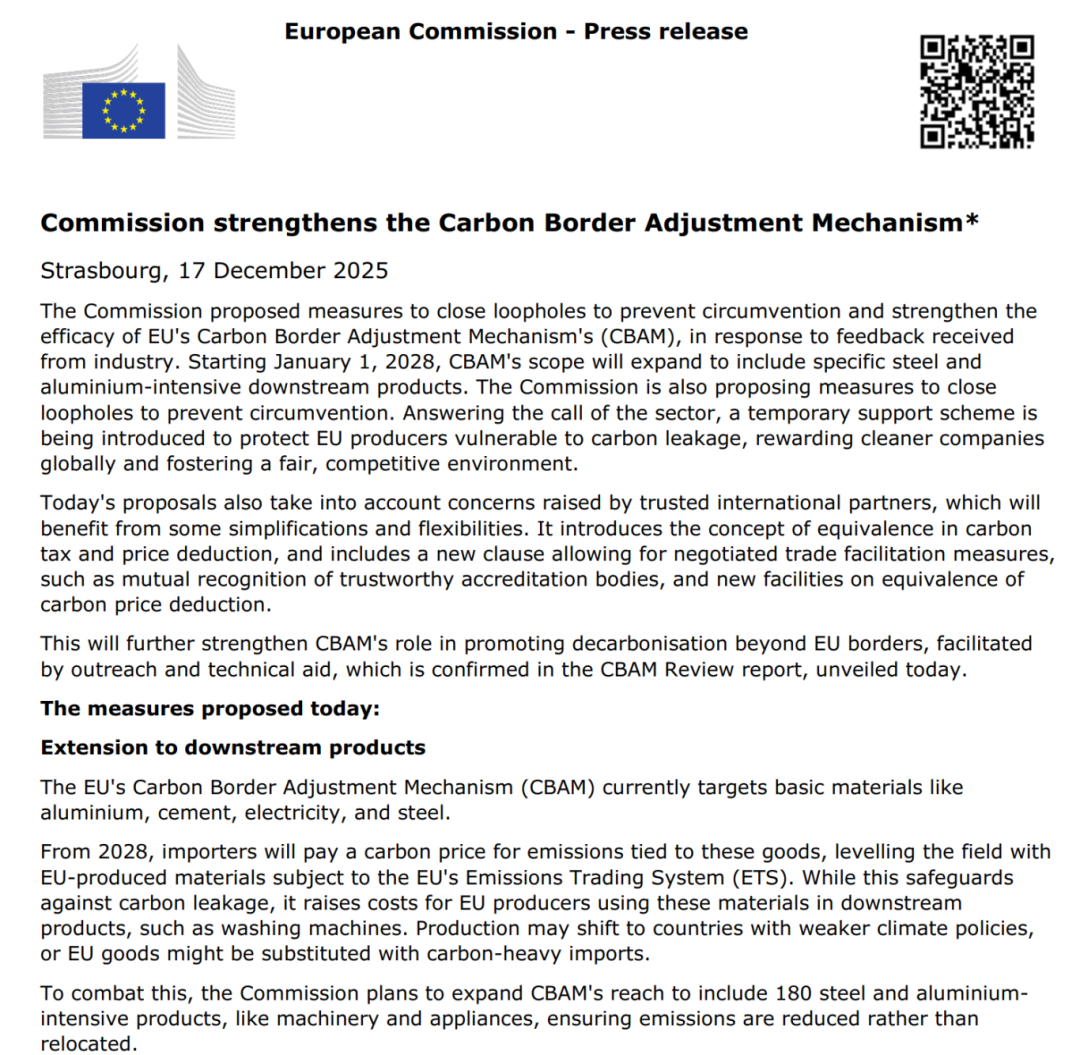 12月17日,欧盟委员会提出调整欧盟碳边境调节机制(CBAM)的系统性升级方案,重点通过扩展适用范围、强化反规避机制和设立临时脱碳支持基金,提升CBAM在防范碳泄漏和推动全球减排中的有效性。根据提案,自2028年起,CBAM将从钢铁、铝、水泥、电力等基础材料,扩展至约180类钢铁和铝密集型下游产品涵盖机械设备、工业零部件、车辆部件及部分家电产品