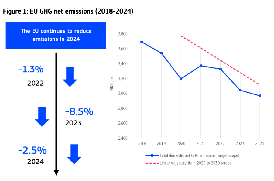 11月6日,欧盟委员会发布《2025年欧盟气候行动进展报告》,《报告》显示,2024年欧盟温室气体排放量预计下降2.5%,延续了前几年的下降趋势。表明欧盟有望实现其2030年减排目标,即与1990年相比减少55%。