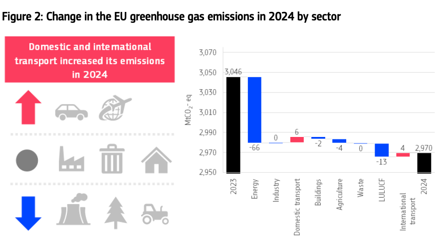 报告指出,欧盟正持续推动经济增长与碳排放脱钩——2024年GDP小幅增长,而碳排放量继续下降。减排的主要动力来自电力和工业部门,这得益于可再生能源的快速扩张、能源效率提升,以及煤炭和天然气使用量的持续下降。2024年减排最大贡献来自能源行业,排放量下降约8.5%。
