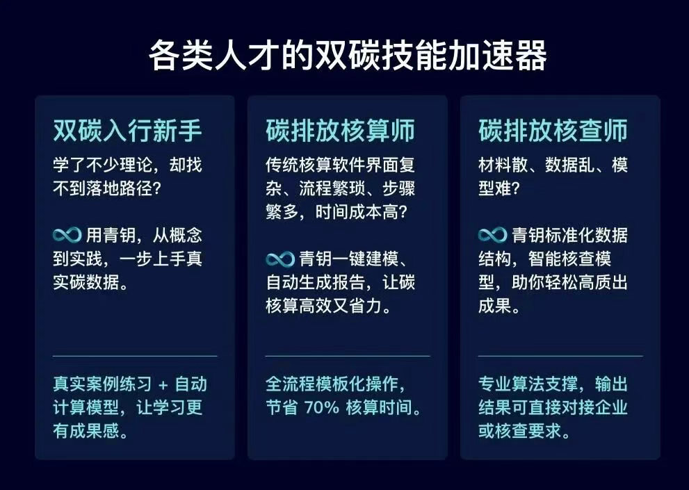 工欲善其事,必先利其器。在基础的核算功能外,青钥Cyacle也致力于帮助不同职业阶段的求职者掌握碳管理技能,实现从“碳管理入门”到“职业能力落地”的快速跨越:
