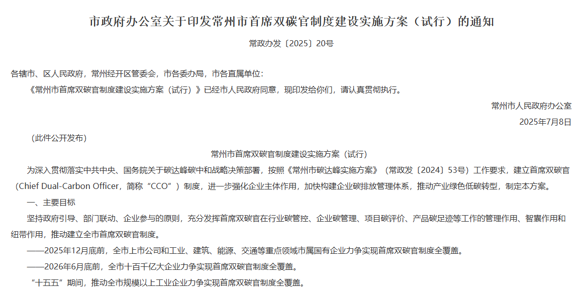 《常州市首席双碳官制度建设实施方案(试行)》,图源:常州市人民政府