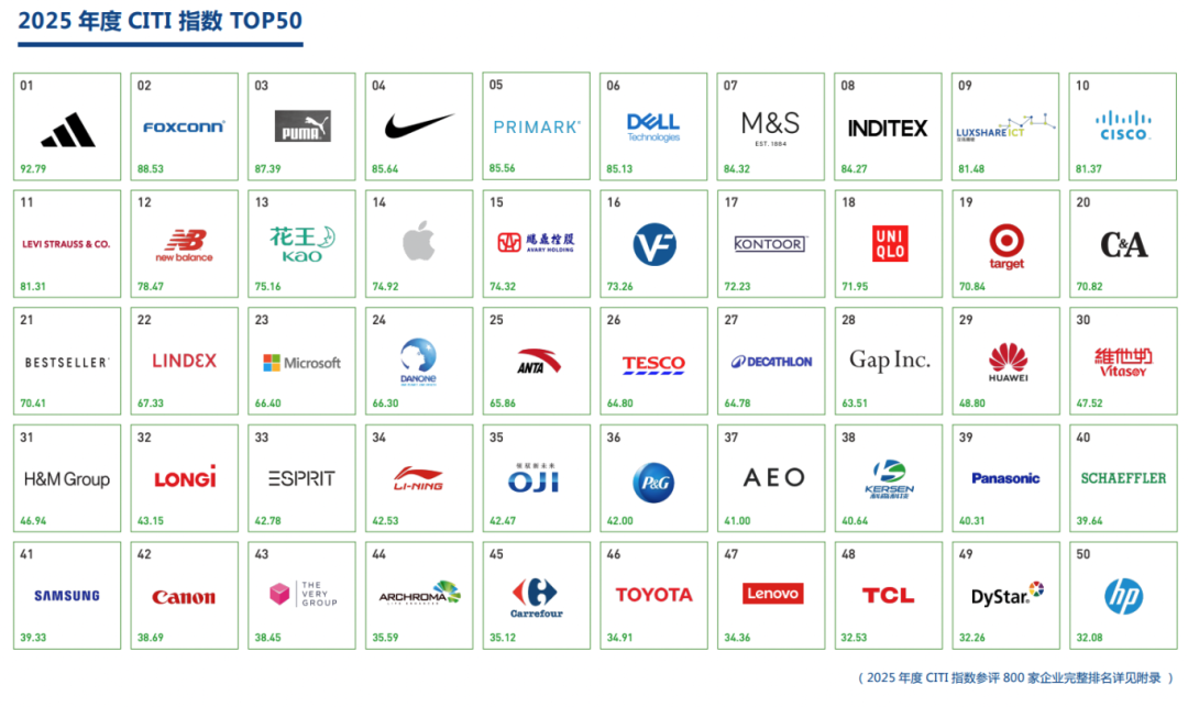 这是IPE连续十二年发布绿色供应链CITI指数年度报告,也是连续八年开展供应链气候行动指数年度评价。在对23个行业的800家中外企业的评价中,一批中外品牌因出色表现脱颖而出。阿迪达斯、富士康、彪马在CITI指数和CATI指数评价中均名列前三名,显示出较为完备的管理体系和强大的执行能力。耐克、Primark、戴尔、马莎百货、Inditex、立讯精密、思科、苹果跻身两个指数前十。