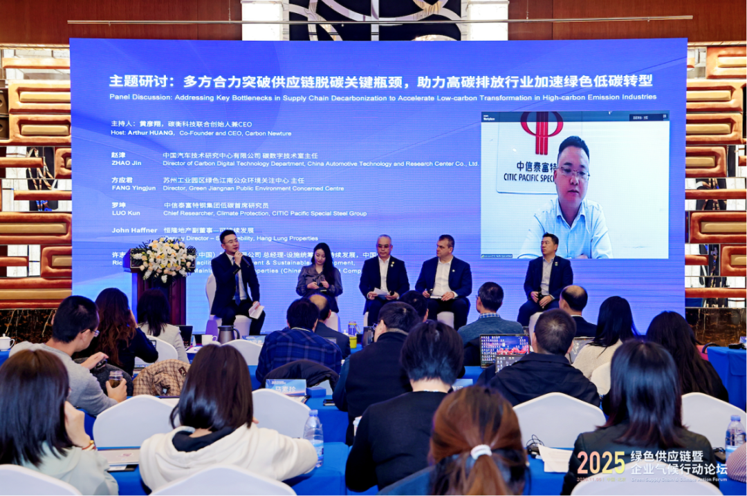 在“多方合力突破供应链脱碳关键瓶颈,助力高碳排放行业加速绿色低碳转型”主题研讨环节,碳衡科技CEO黄彦翔作为主持人,与中国汽车技术研究中心有限公司碳数字技术室主任赵津、苏州工业园区绿色江南公众环境关注中心主任方应君、中信泰富特钢集团低碳首席研究员罗坤、恒隆地产副董事-可持续发展John Haffner、太古地产(中国)投资有限公司中国内地设施统筹及可持续发展总经理许志忍,共话供应链脱碳瓶颈与行业特色解法,并与大家分享了企业绿色供应链转型领先实践。