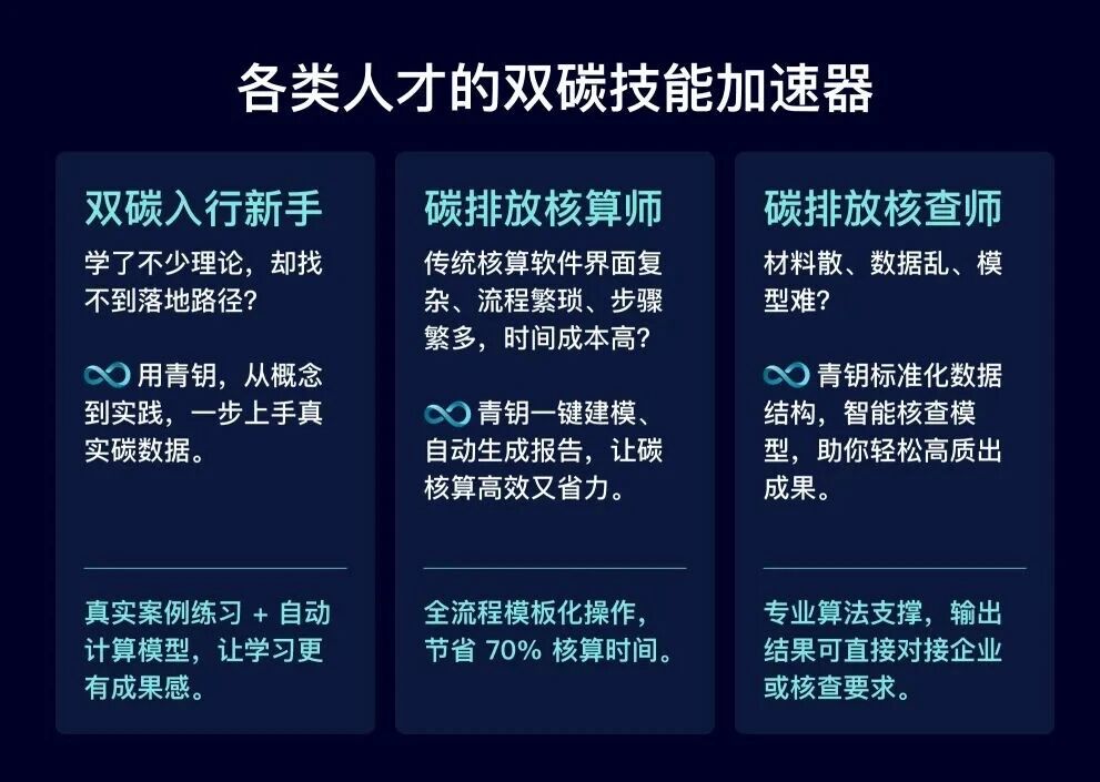 无论你是刚入行的双碳新手,还是深耕行业的碳排放核算师、核查师;无论你是应届生、转型中的职场人士,还是制造业等行业的ESG从业者,青钥·Cyacle作为各类人才的双碳技能加速器,能精准匹配你所有的需求,节约学习成本,成为你通往专业的那把“钥匙”。