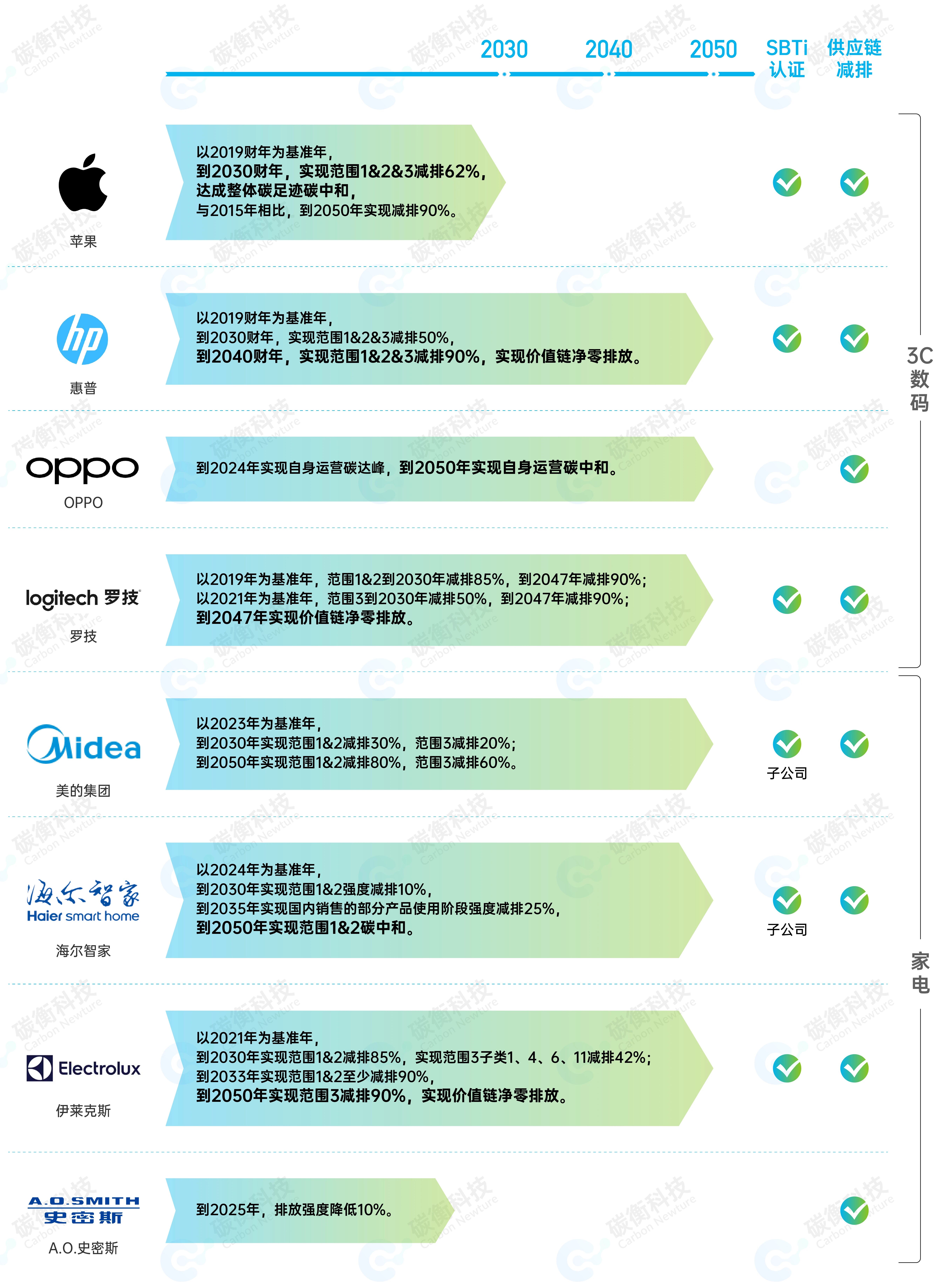 如下表所示,本文统计了苹果、惠普、OPPO、罗技、美的集团、海尔智家、伊莱克斯、A.O.史密斯这8家企业公布的碳目标。